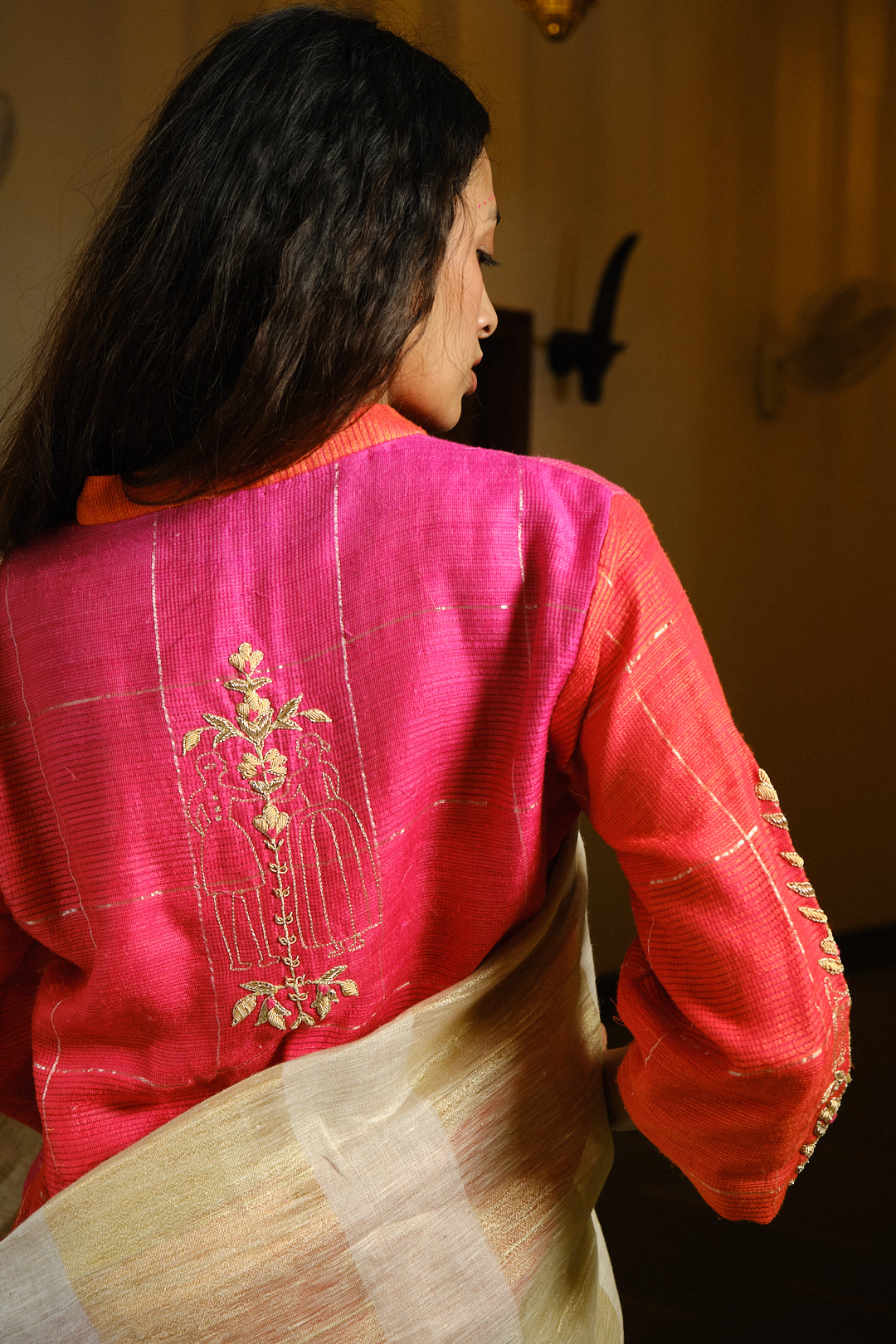 The most potent force is one that carries both earth and fire within. On this sacred day of Ashtami, we unveil Durgā, the first expression of our Shaktih collection. This piece captures that glorious duality: a gorgeous, lustrous gold linen saree that grounds you in comfort, paired with a structured top in vibrant Rani Pink and Fuchsia. It's modern strength draped in effortless elegance. Every detail—from the rich handmade tassels to the gold-toned embroidery (representing harmonious union, if visible)—is a reminder of the multifaceted power you embody. Aeka celebrates the woman who defines her own tradition. Wear your power. Wear your linen. Shop Durgā now.